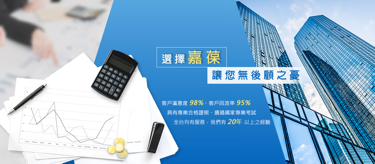 嘉葆提供稅務規劃、全程電腦化作業、e化網路申報,在合法範圍內協助客戶規劃節稅,另設計完善的資料櫃針對客戶資料妥善保存,可有效節省客戶相關成本。且嘉葆在全台均有服務,客戶的滿意度98%、客戶回流率95%,選擇嘉葆讓你在經營上無後顧之憂,合理的價格完整的稅務諮詢、規劃,我們會是您創業的最佳夥伴。