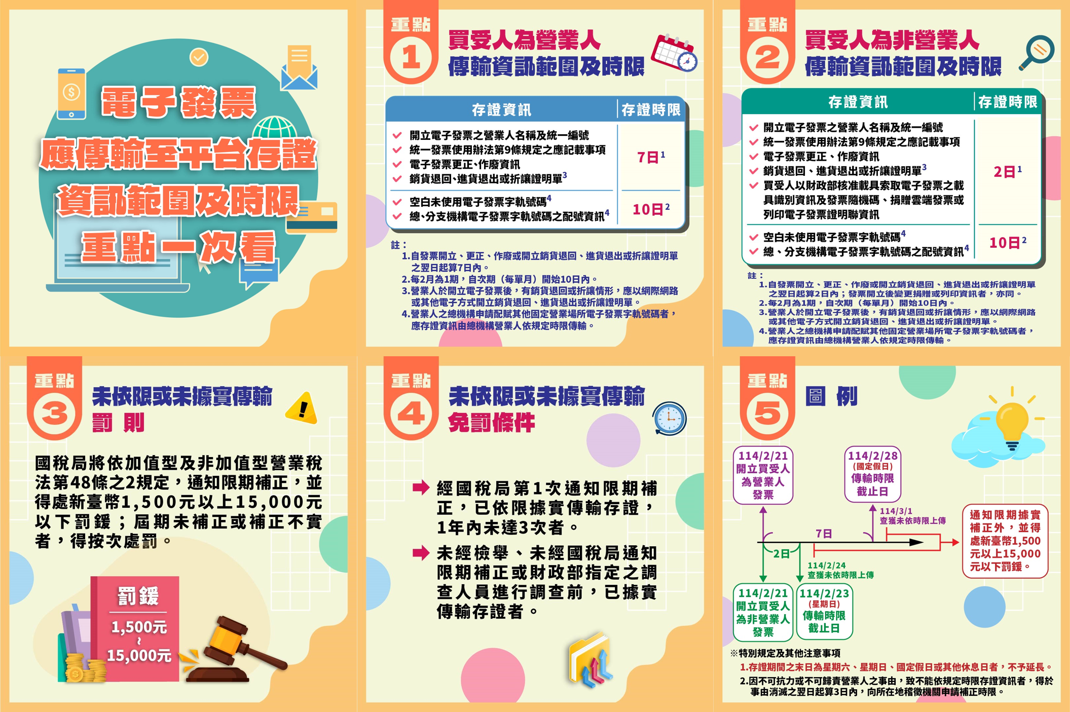 自114年1月1日起,營業人銷售貨物或勞務開立電子發票, 應於規定時限內將電子發票與相關必要資訊據實上傳至財政部電子發票整合服務平台存證, 未依規定時限或未據實傳輸存證者,國稅局將通知限期補正, 並得處新臺幣1,500元以上15,000元以下罰鍰,屆期未補正或補正不實,得按次處罰。 資料來源:財政部 / 電子發票資訊存證宣導專區